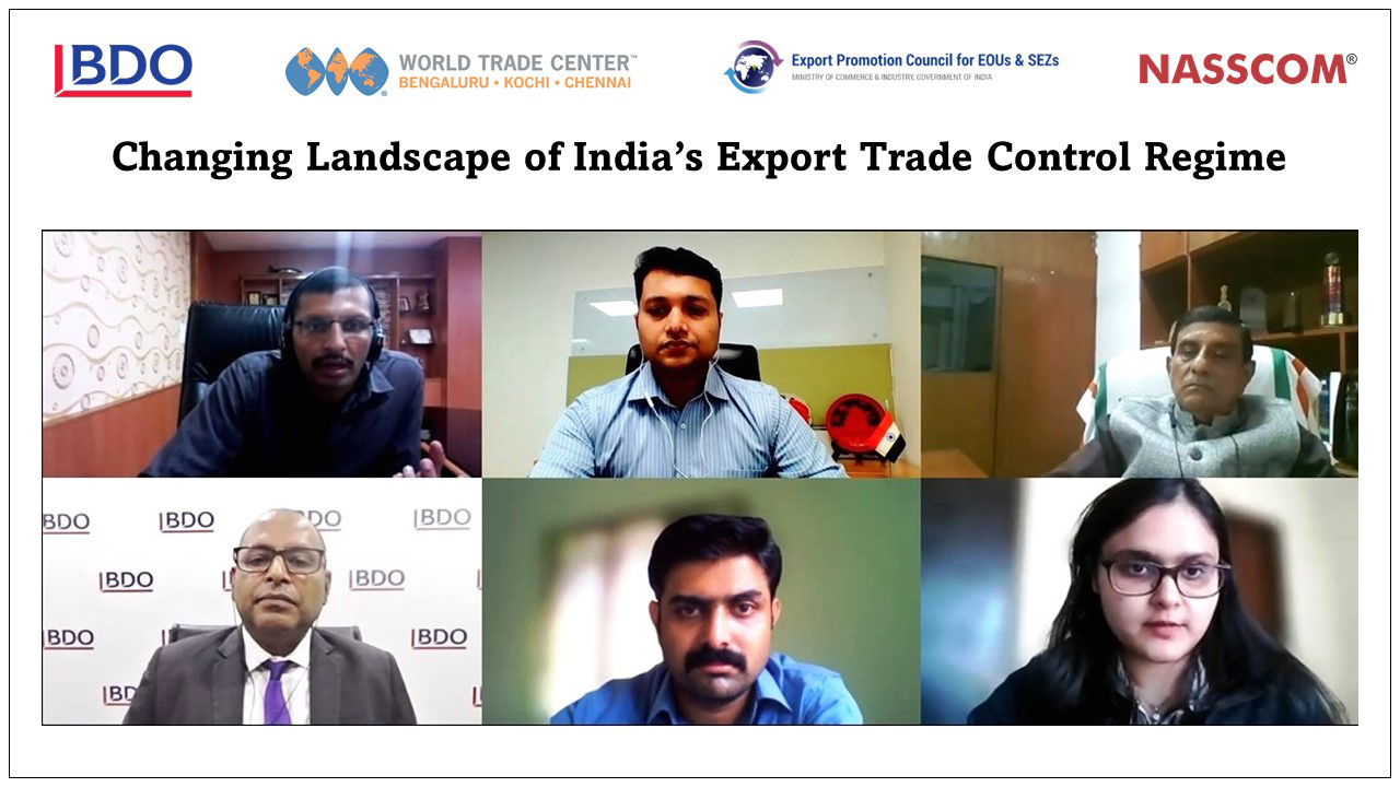 We organized a webinar on “Changing Landscape of India’s Export Trade Control Regime” in association with the Export Promotion Council for EOUs and SEZs (EPCES) and NASSCOM. Mr. K.M. Harilal ITS, Joint Director General of Foreign Trade, Kochi was the keynote speaker. Mr. Krishna Barad, Partner/ Customs & International Trade, Indirect Tax, BDO India spoke on the subject, Ms. Garima Prakash, Deputy Manager - Public Policy, NASSCOM detailed on the technological aspects. Mr. K.K. Pillai, Regional Chairman, EPCES also spoke at the event. Mr. Harilal in his keynote address gave the participants a background of SCOMET and how it came to be. He spoke about the mandatory approvals, authorizations, certificates and licenses that units exporting products classified under SCOMET should procure. He pointed out that not many exporters are aware of this requirement. He also briefed on the penalties and legal action that would be taken against the exporters not adhering to the regulations. Mr. Krishna Barad in his presentation covered the Export Trade Control measures in other parts of the world like USA, EU, Australia and Asia. He listed the ‘dual use’ items that comes under SCOMET which find civilian as well as military applications. He explained the Export Control Classification Number and the identification procedure. He explained the impact SCOMET has on importers, exporters, buyers, vendors and suppliers. An overview of the categories and subcategories of the SCOMET items were provided by Mr. Barad. He detailed on the SCOMET application process with the DGFT. Ms. Garima Prakash spoke on the technological aspects of SCOMET such as intangible transfers, electronics, technology, telecommunications, information security. She also briefed on the way forward for the Export control regime such as bulk licenses, fully digitizes and integrated licensing portal and query helpdesk. Participants included exporters, SEZ units, manufacturing units, CXOs, business owners etc.